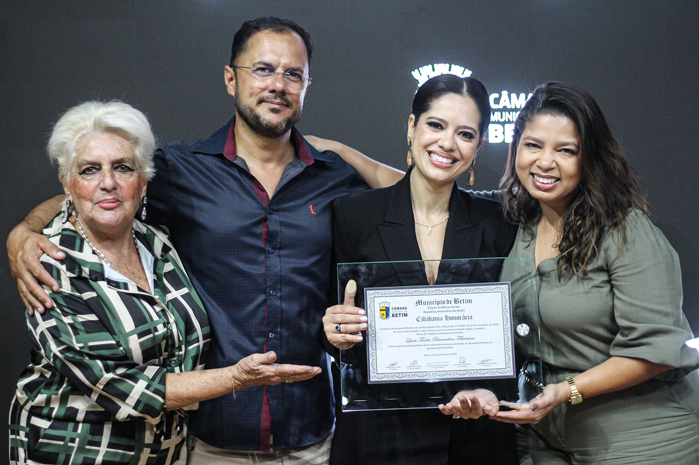 Destaque 2. A advogada Laisa Felicíssimo (terceira na foto) recebeu, no último dia 14, o título de Cidadania Honorária em cerimônia realizada pela Câmara Municipal de Betim. Na foto, ela com a mãe, Vanessa Felicíssimo, o cunhado Abelardo e a irmã Geísa Felicíssimo.